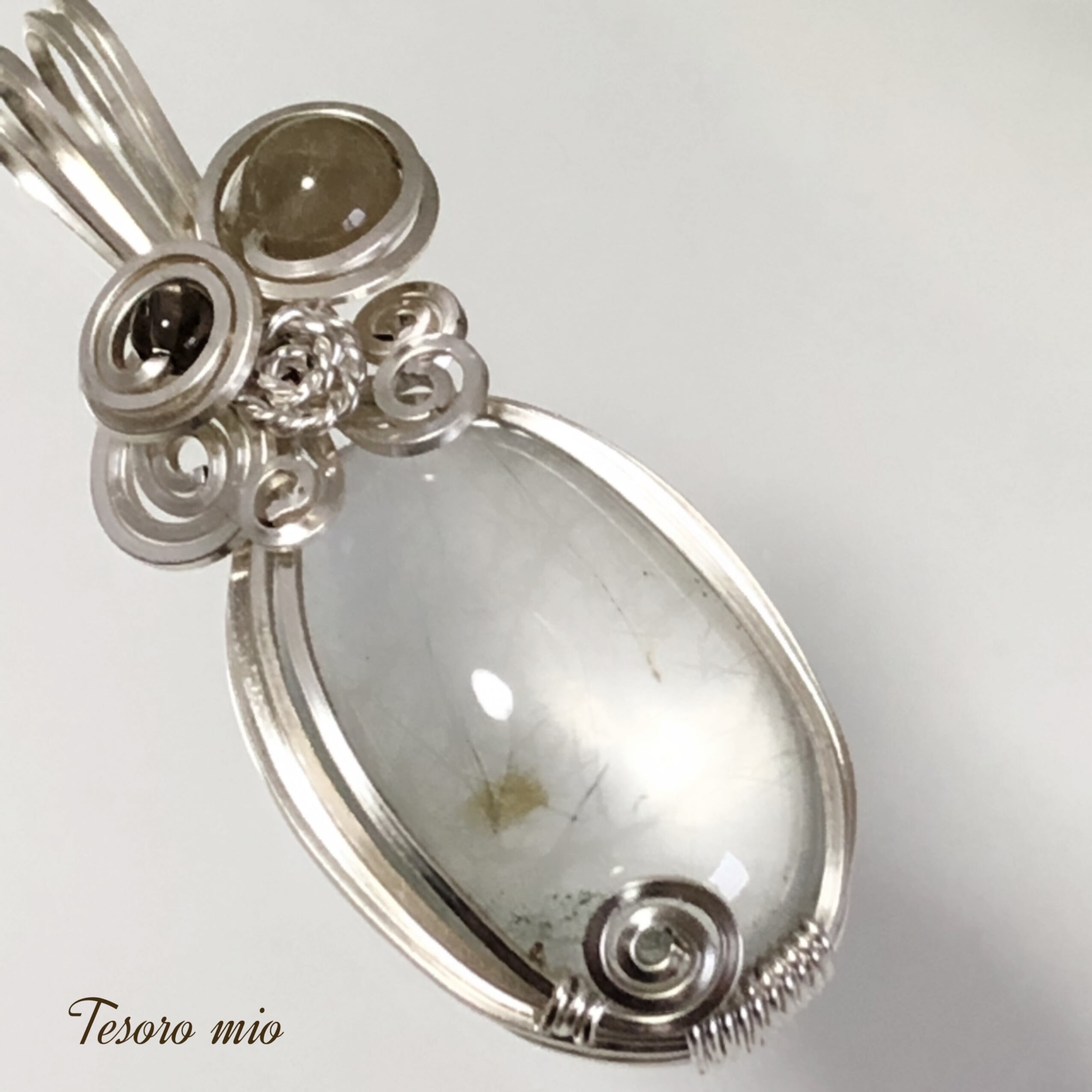 インクルージョン(内包物)は様々で、決して同じものはなく、一点ものとなる、ミャンマー産のガーデンクォーツを角線(断面が四角いワイヤー)で丁寧に包み込み、ペンダントトップにしました☆