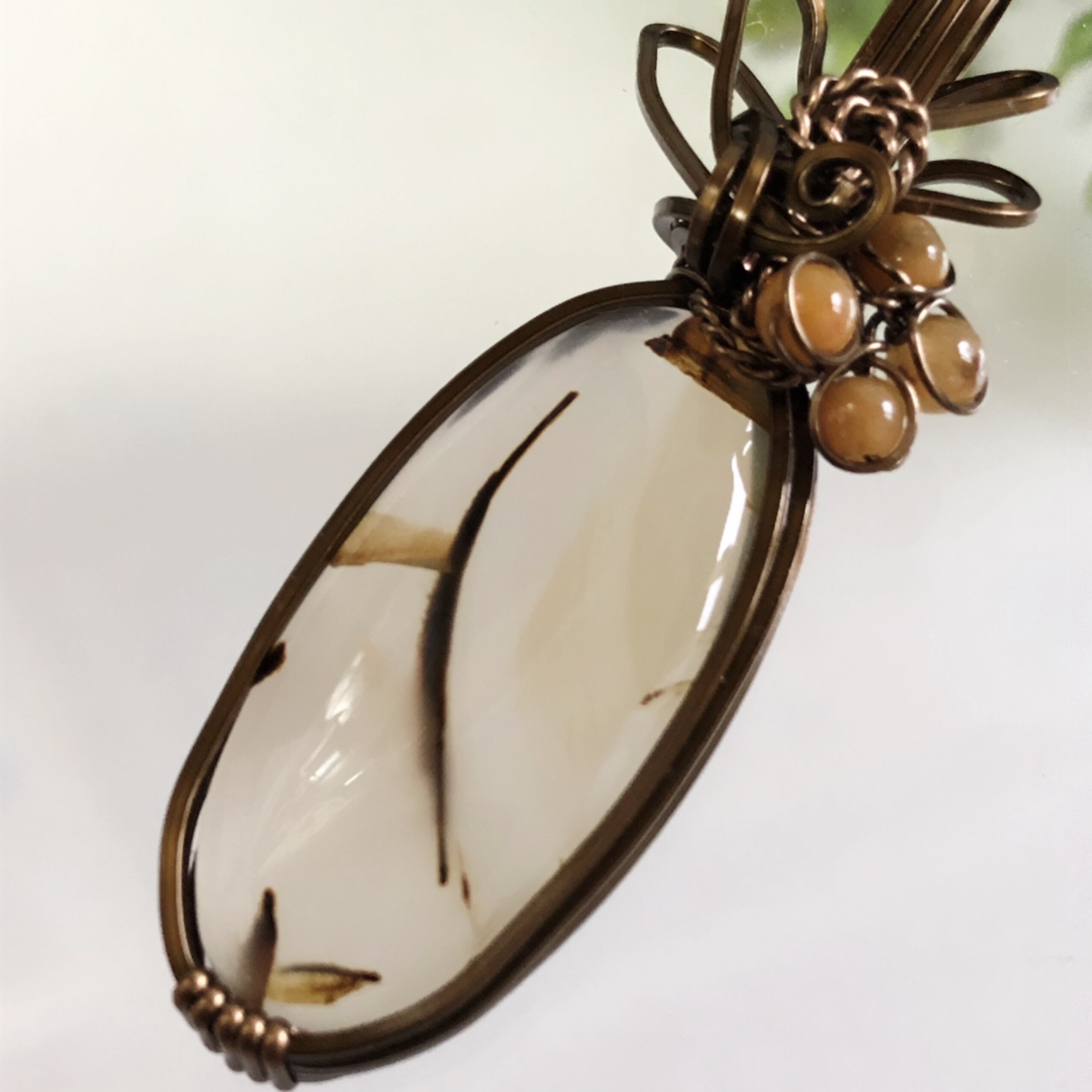 そんなモンタナアゲートをビンテージブロンズのスクエアワイヤーでデザインし、ミックスルチルクオーツで小さな花を添えました。