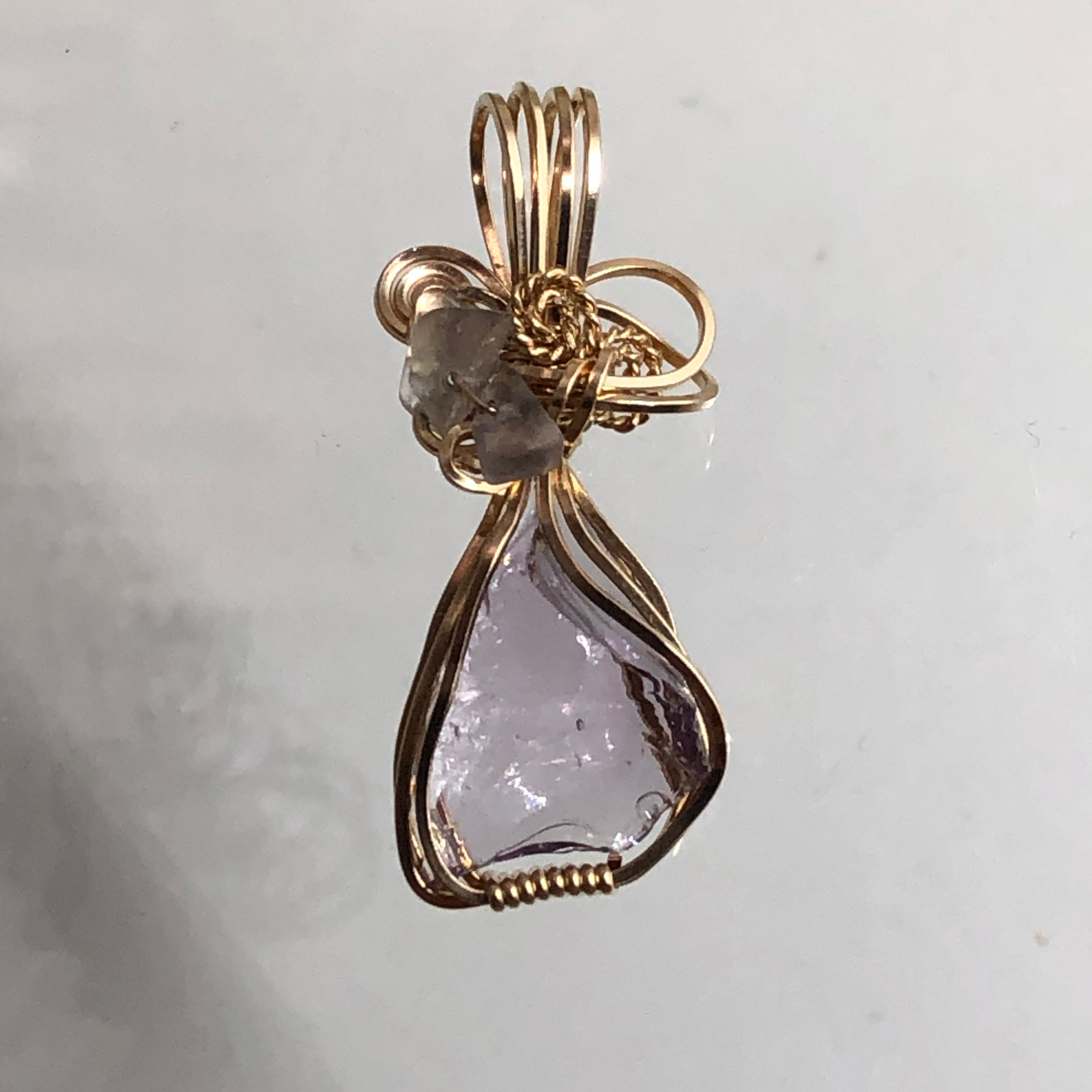 そんなアンダラクリスタルを、14Kgfのスクエアワイヤーでデザインし、フローライトのさざれでドレスアップしました。