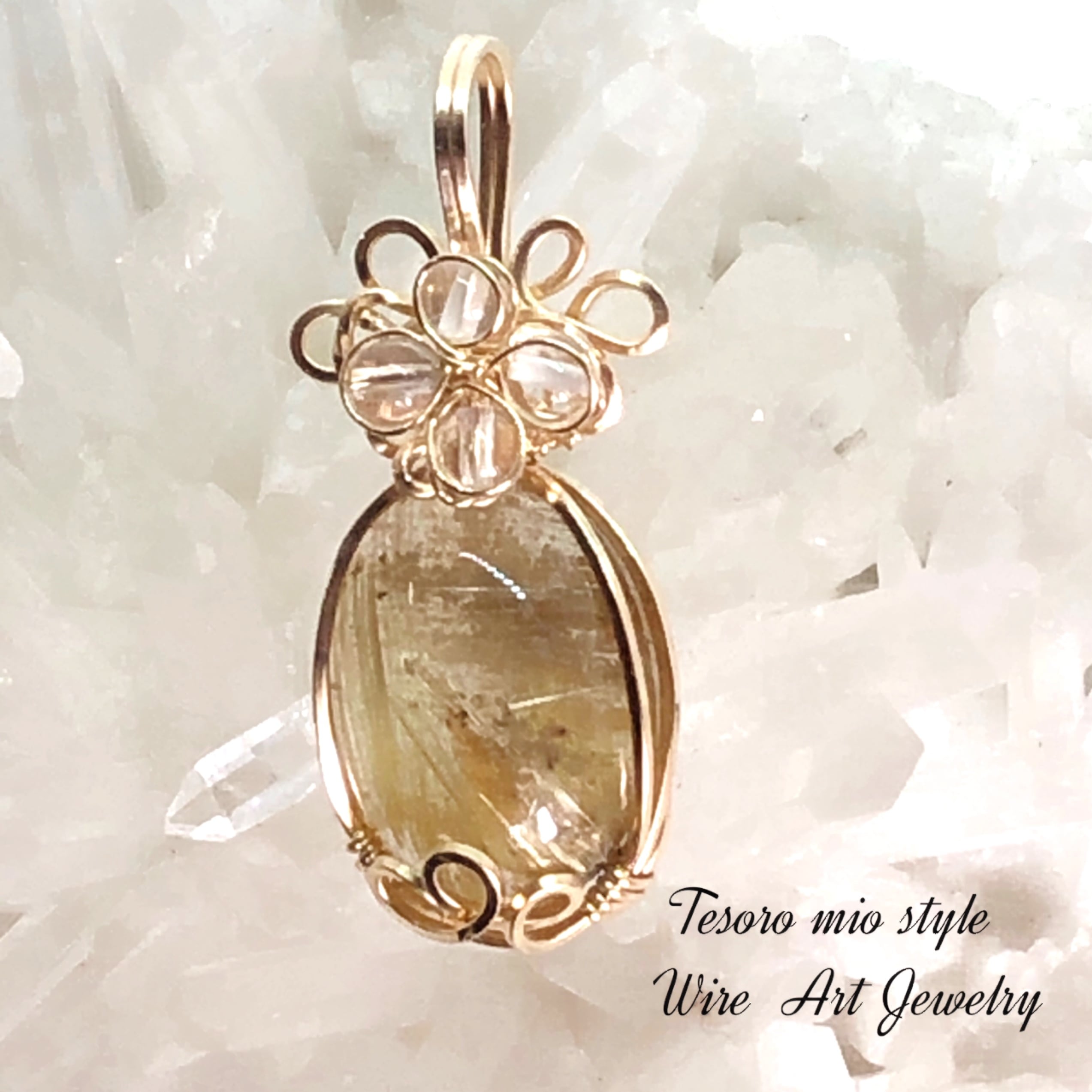 その可愛いフォルムに合わせて、14Kgfのスクエアワイヤーでラッピングしながら、水晶とワイヤーで花飾りをつけて仕上げています。