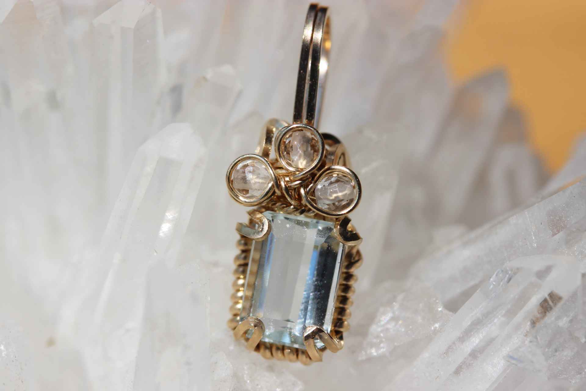 そんなカット加工された小さなアクアマリンに水晶の飾りをつけて、14Kgfのスクエアワイヤー(断面が四角いワイヤー)で丁寧に包み込み、ペンダントトップにしました☆