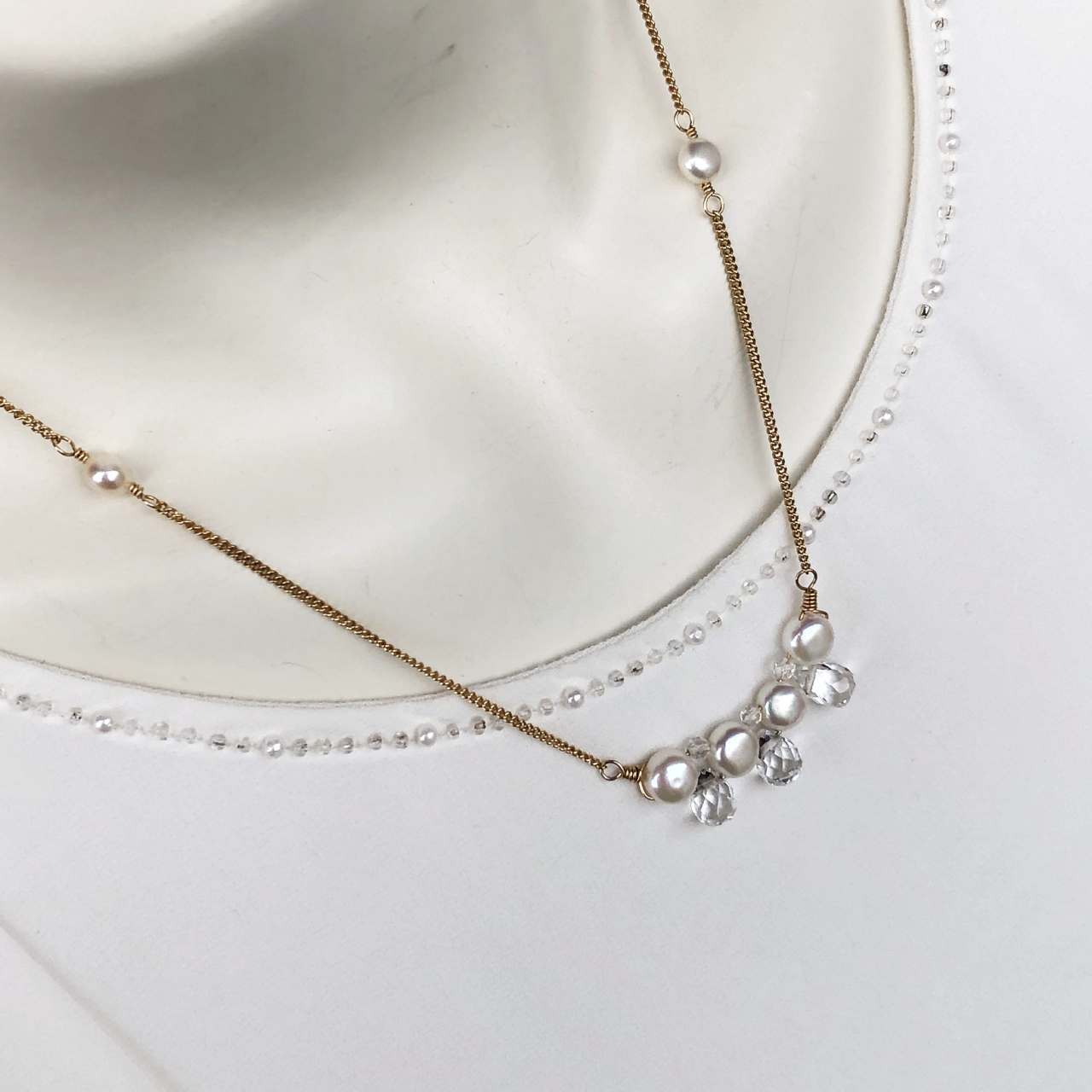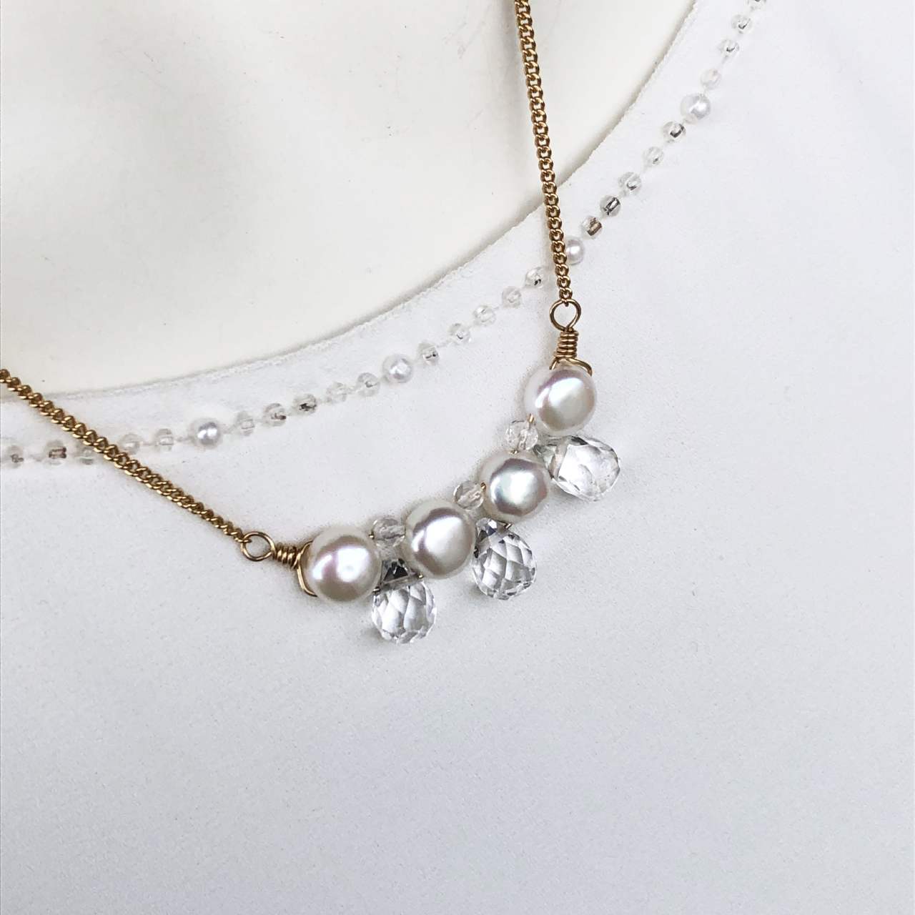 約8㎜の2つ穴のパールの間に、カット加工された小さなラウンド水晶とドロップ型の水晶を合わせています。
