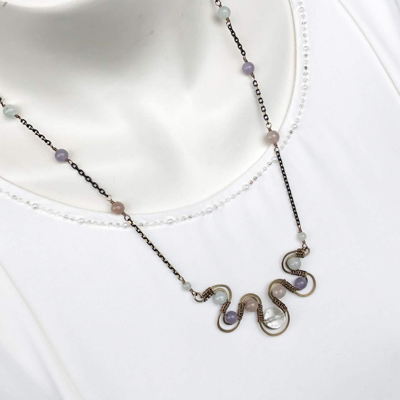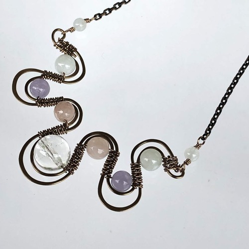 うねりを出したワイヤーをハンマリングして、オーロラのように淡い色の天然石をちらべました。