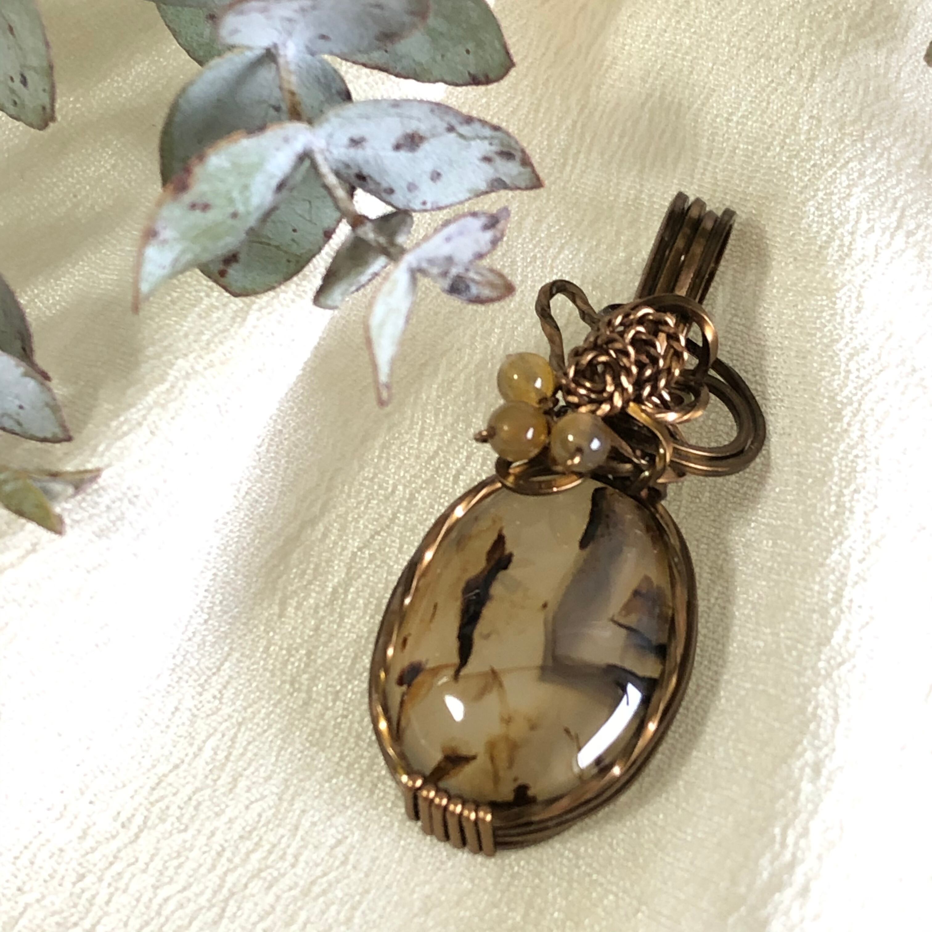 そんなモンタナアゲートをビンテージブロンズのスクエアワイヤーでデザインし、ミックスルチルクオーツで小さな花を添えました。