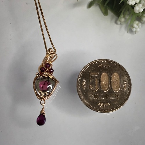 幸せを呼び寄せる石ともされているウォータメロントルマリンを14Kgfのスクエアワイヤー(断面が四角いワイヤー)で丁寧に包み込み、小さなガーネットをあしらって、また、ドロップ型のガーネットをゆらゆらやれるようにぶら下げたとってもキュートなペンダントトップにしてお届けいたします。