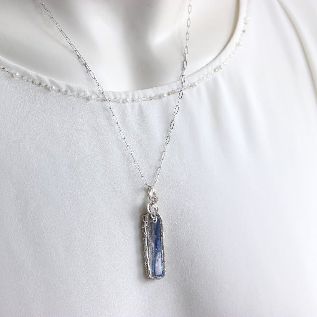 こちらは原石のカイヤナイトを表・裏こちらでも使えるようにシルバーのスクエアワイヤー(断面が四角いワイヤー)で包み込み、ペンダントトップにしました☆